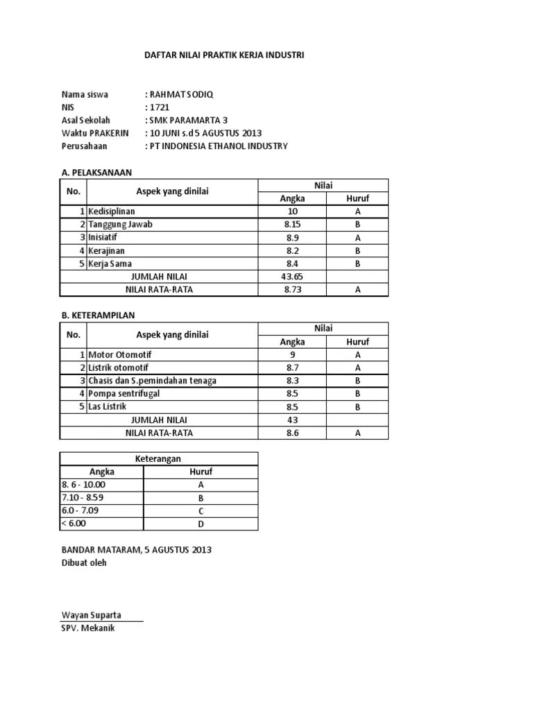 Contoh Nilai Pkl Dari Perusahaan : Format Penilaian Pkl : Daftar nilai pkl dari dosen pembimbing perusahaan (fotocopy rangkap 2).. Contoh perangkat lunak yang menggunakan bahasa pemrograman. Lembar penilaian dosen pembimbing jurusan. Kesan dan saran pembimbing perusahaan/ industri. Pkl dapat dilaksanakan di perusahaan/instansi/lembaga yang bergerak dibidang. Pengolahan hasil perikanan, dan perusahaan perdagangan hasil perikanan),.